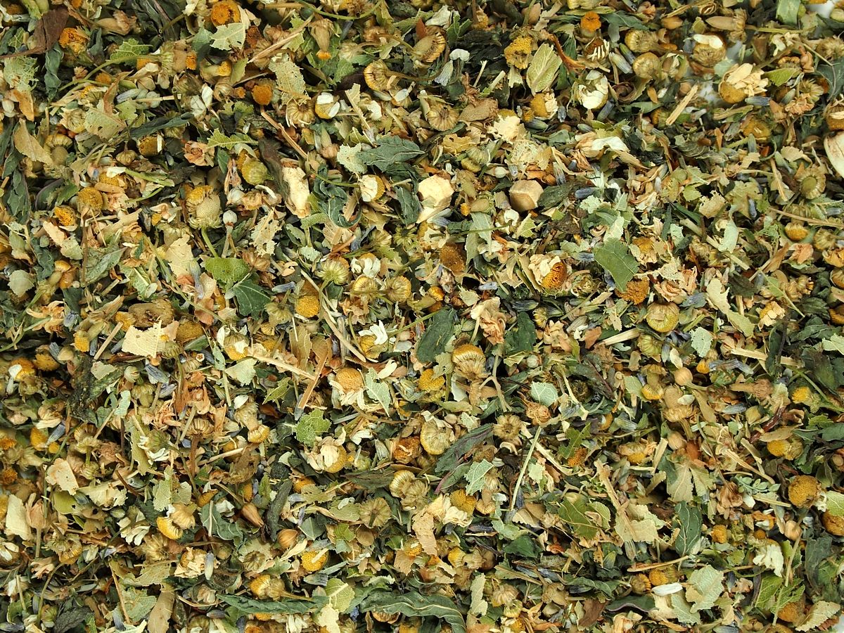 Květy heřmánku, lípy, levandule, listy máty peprné, kousky lékořice