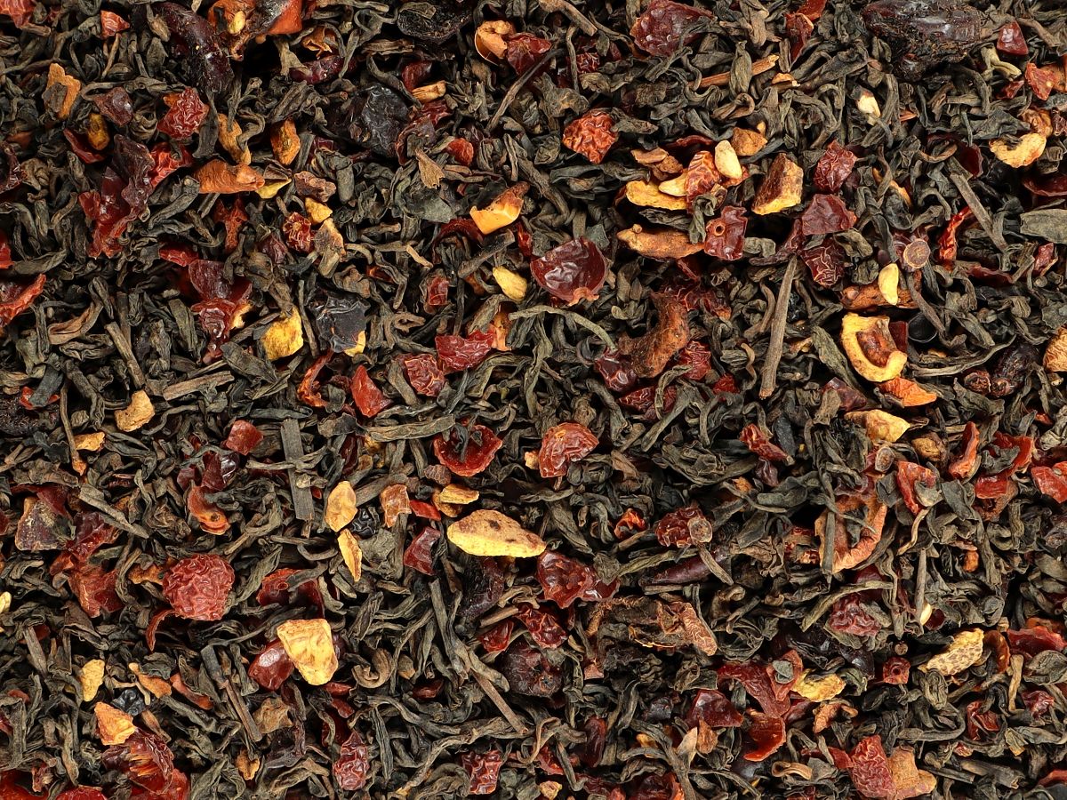 Pravý černý čaj Pu-Erh (54 %), šípek, klikva velkoplodá (kanadská brusinka) (klikva, cukr, slunečnicový olej), jablka, kůra granátového jablka, aroma. Může obsahovat stopy skořápkových plodů. Výživové údaje na 100 ml: energetická hodnota 18 kJ/ 4 kcal, tuky 0 g (z toho nasycené mastné kyseliny 0 g), sacharidy 0 g (z toho cukry 0 g), bílkoviny 0 g, sůl 0.03 g.