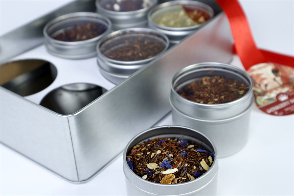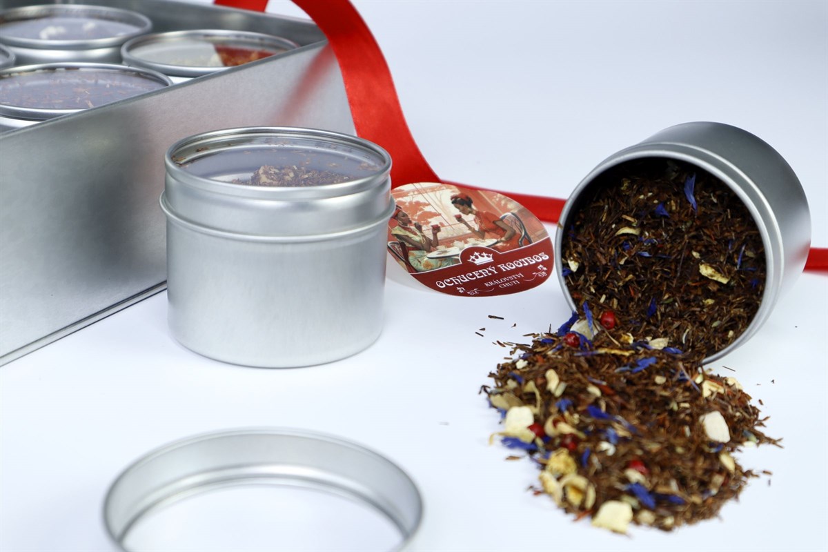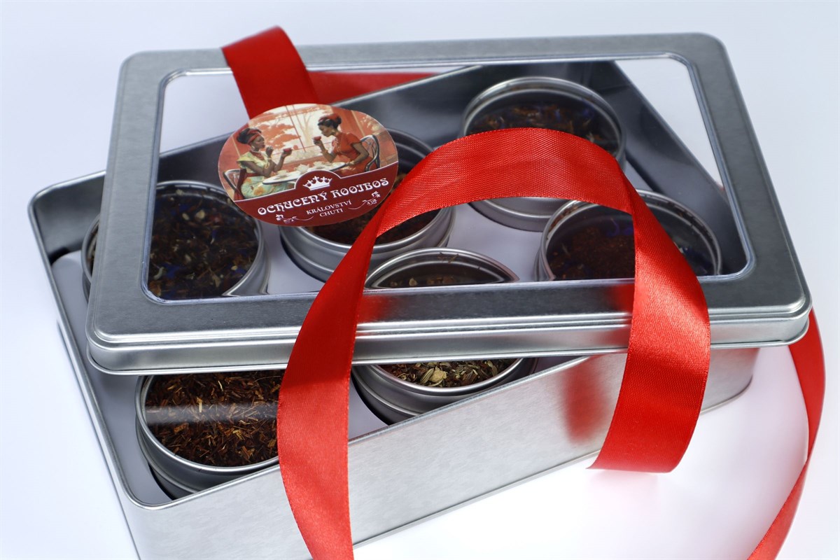 Pro milovníky jemných a aromatických čajů přinášíme dárkovou sadu rooibos čajů, která vás okouzlí svou pestrostí chutí. Elegantní kovová dóza ukrývá šest malých plechových dóziček, z nichž každá obsahuje jinou variantu ochuceného rooibosu. Celková hmotnost sady je 190 g, což vystačí na přibližně 35–45 šálků čaje podle velikosti porce. Rooibos neobsahuje kofein, takže si jeho bohatou chuť můžete užívat kdykoli během dne.