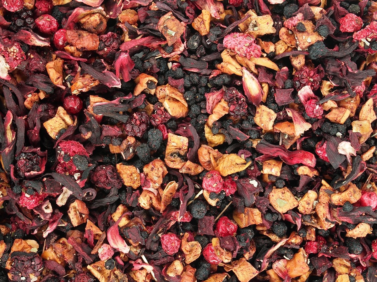 Bezinky, jablka, ibišek, arónie, červená řepa, ostružiny, aroma, červený rybíz, maliny, listy ostružiníku, jahody. Může obsahovat stopy skořápkových plodů.