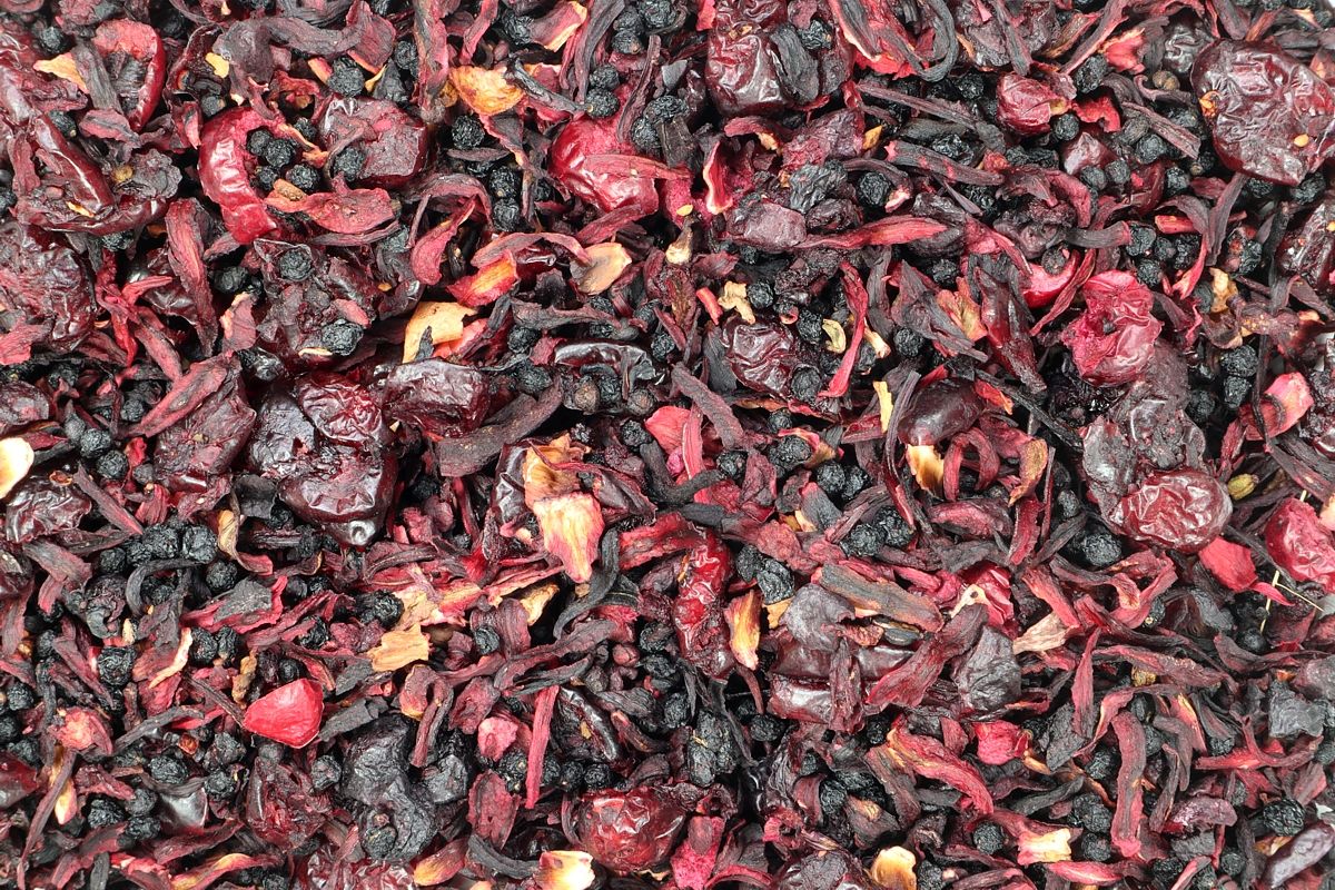 brusinky (brusinky, cukr, slun.olej), bezinky, ibišek, višně (5 %), lyofilizované třešně (5 %), aroma, brusinkové plátky, přírodní aroma