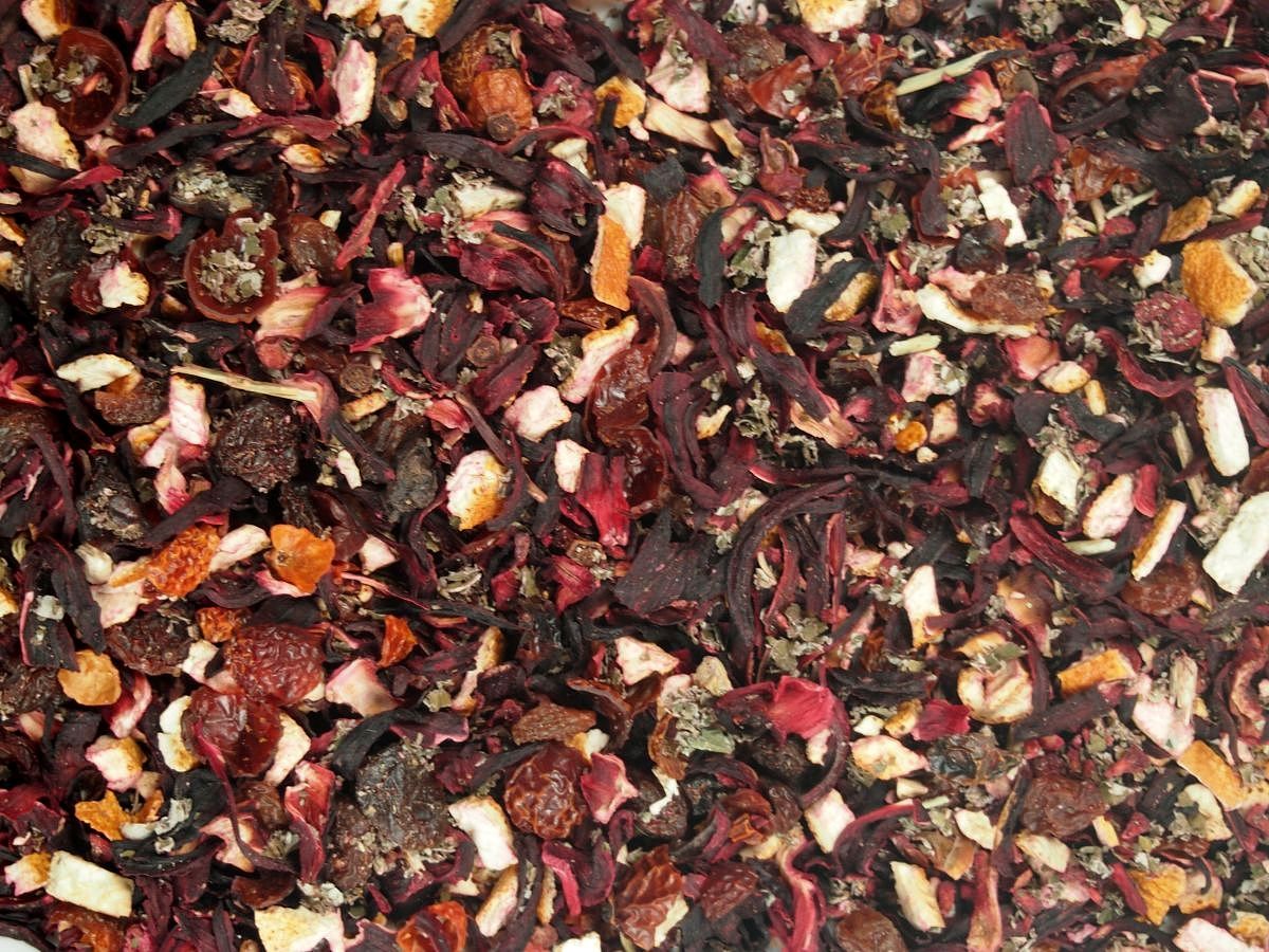 Ibišek súdánský květ, rozinky, pomerančová kůra, šípek, maliny (4 %), maliník list (4 %), přírodní aroma.