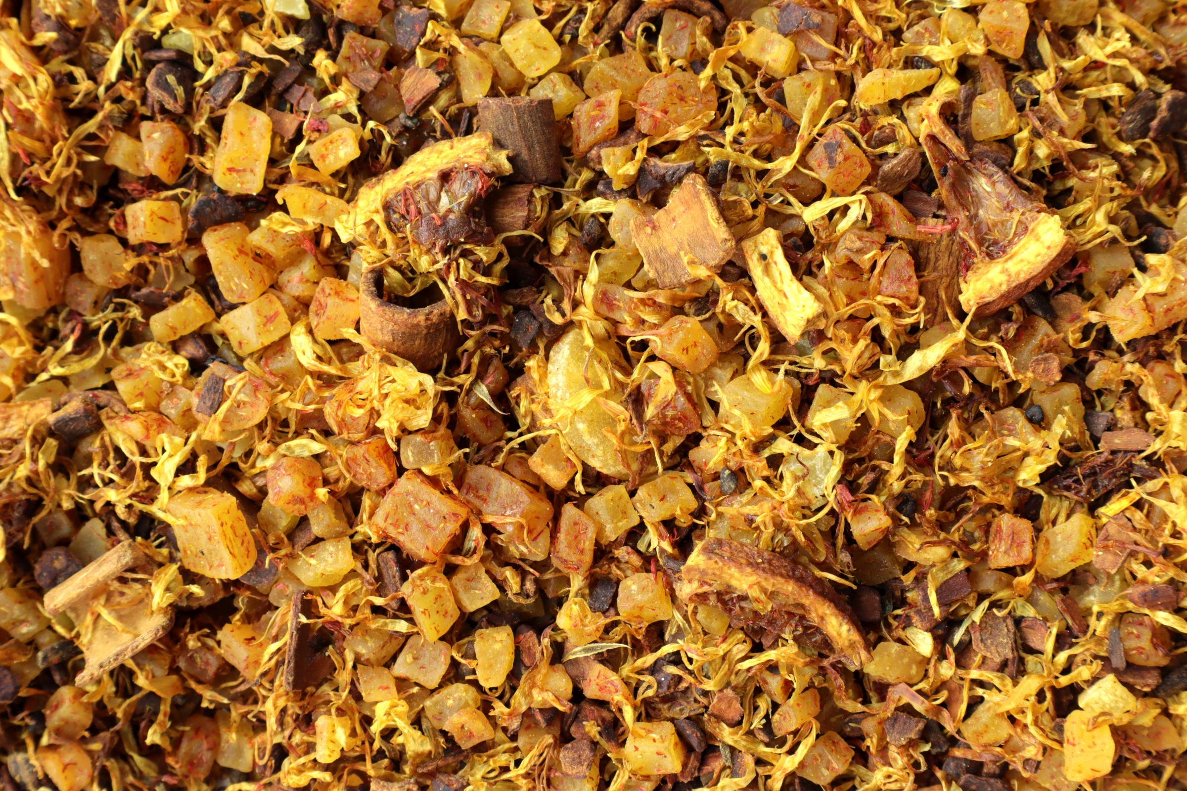 kandovaný ananas (ananas, cukr, kyselina citronová), kandované mango (mango, cukr, kyselina citronová) (26,9 %), skořice, aroma, plátky pomeranče, hřebíček, kardamom, květy měsíčku, směs vitamínů (kyselina askorbová, niacin, vitamín E, kyselina pantothenová, vitamín B6, B2, B1, kyselina listová, biotin, vitamín B12, sušený glukózový sirup), světlice barvířská, přírodní pomerančové aroma, přírodní aroma