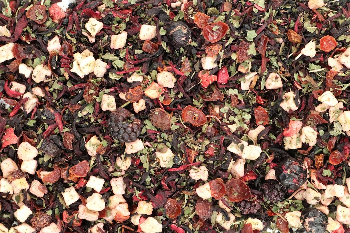 ibišek, jablko, šípkové slupky, bezinky, ostružinové listy, aroma, sladké ostružinové listy, malinové granule (glukózový sirup, cukr, maliny, alginát sodný), černý rybíz, lyofilizované kousky jahod, ostružiny