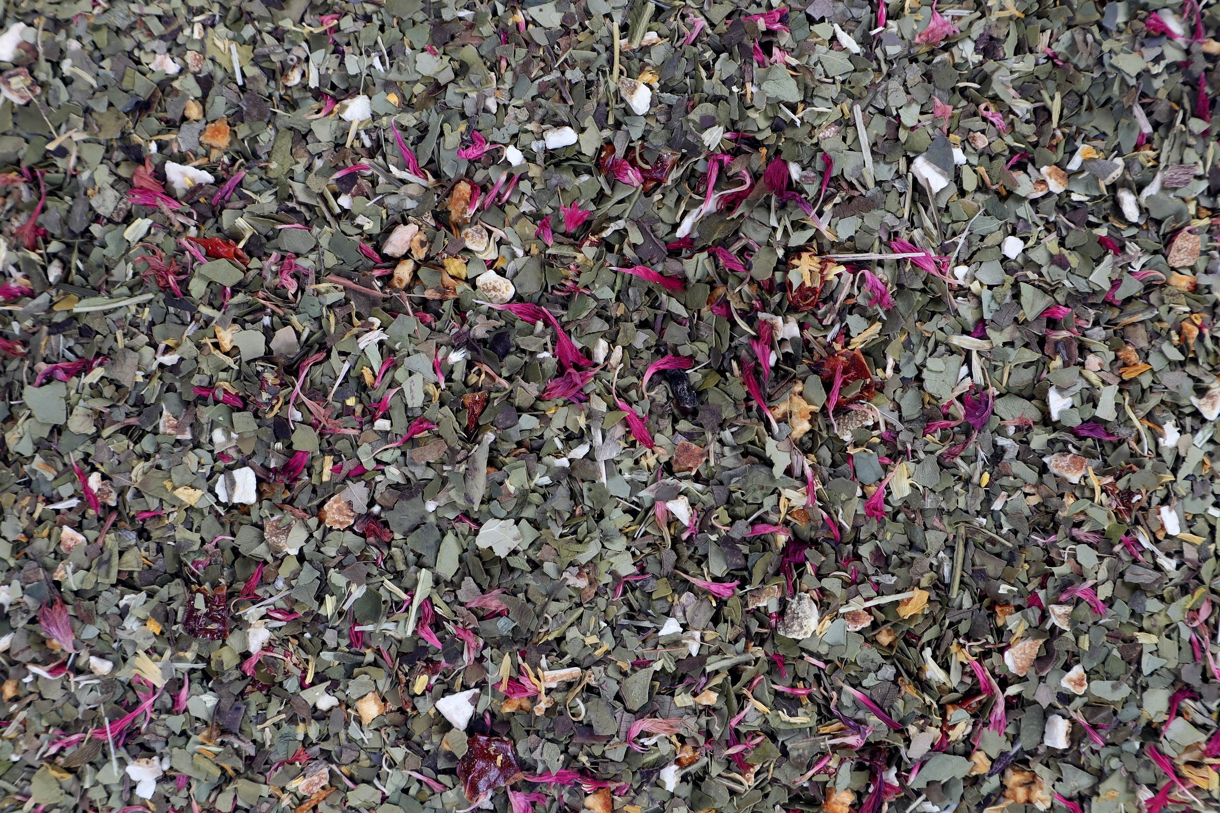 Mate, pomerančová kůra, listy ostružiny, květy měsíčku, paprikové vločky, květy chrpy, přírodní aroma, malinové granule (glukózový sirup, cukr, maliny, zahušťovadlo: alginát sodný).