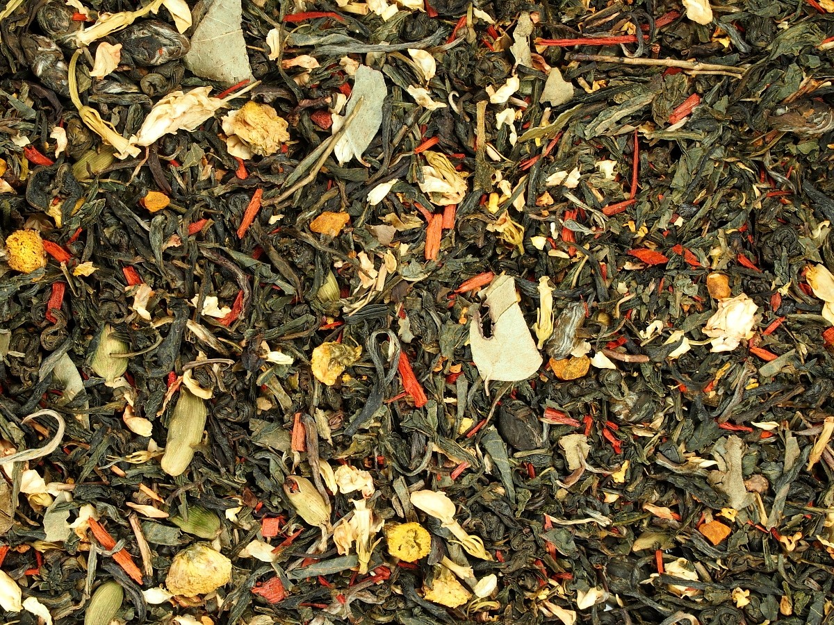 Pravé zelené čaje Sweet Flower, Yunnan Green, Formosa Gunpowder a Phoenix Eyes (72,5 %), pravý bílý čaj Snow Buds, kardamom, aroma, santalové dřevo, kurkuma, chryzantéma, jasmín, osmanthus. Může obsahovat stopy suchých skořápkových plodů.