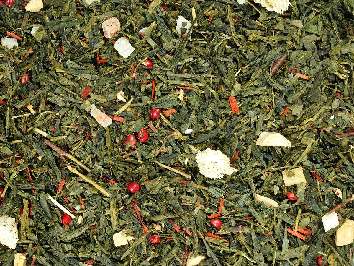 Zelený čaj Sencha s chutí tropického ovoce s tóny koření.