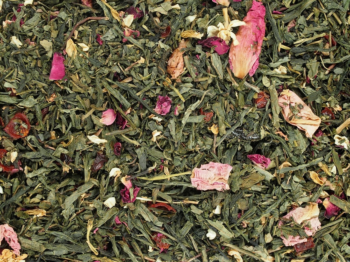 Pravý zelený čaj Sencha a China Jasmin s květy, třešně (třešně, cukr, slunečnicový olej), šípek, aroma, jasmín, pivoňka, růže. Může obsahovat stopy skořápkových plodů.
