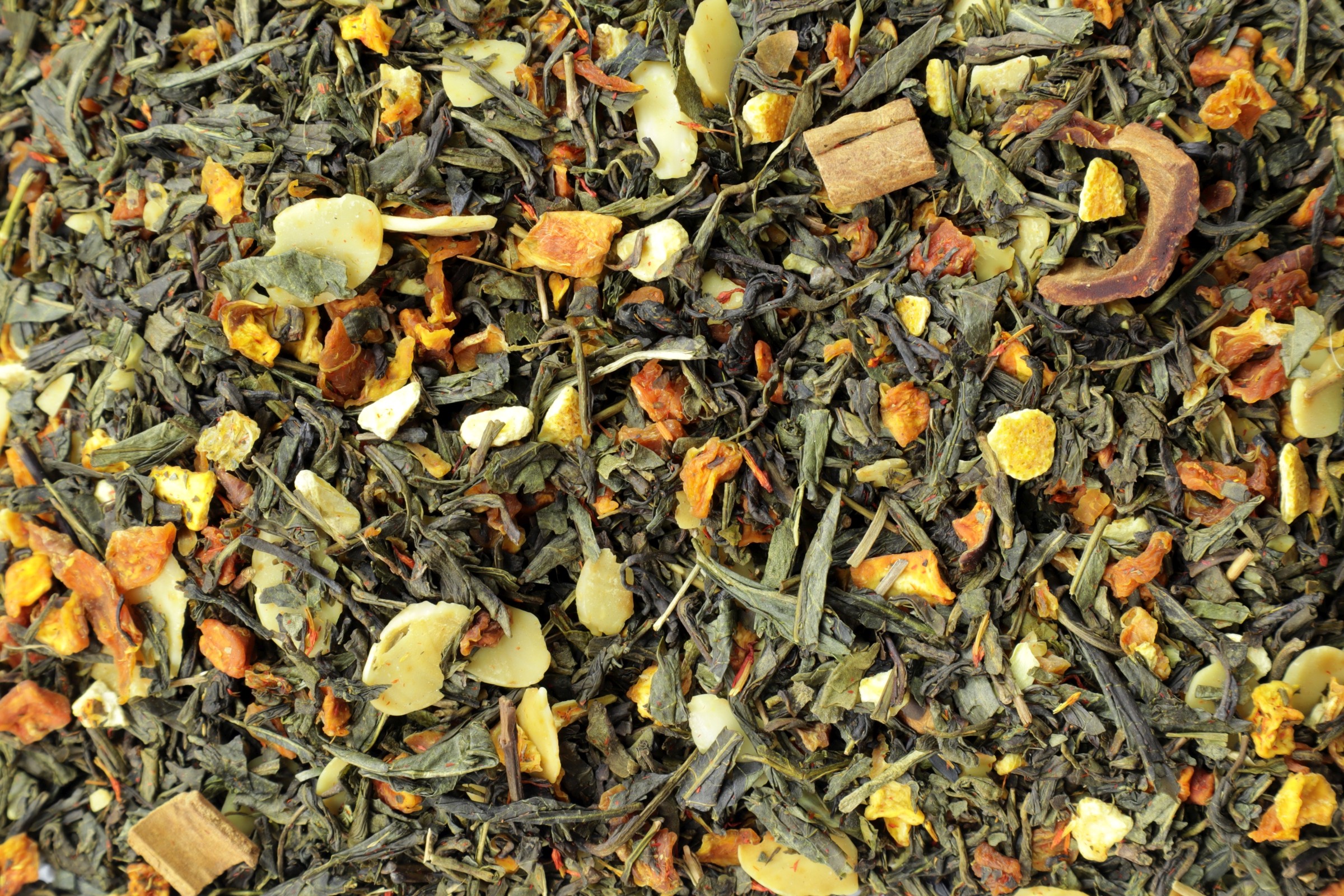 zelený čaj, kousky dýně (20 %), mandle (10 %), aroma, skořice pomerančová kůra, světlice barvířská, přírodní aroma.