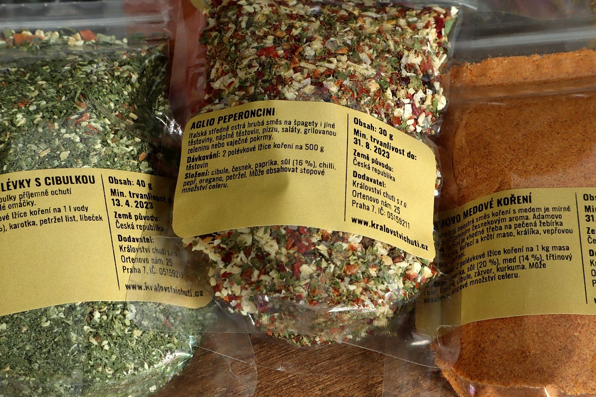 Každý sáček je označen všemi důležitými informacemi, které se vám mohou hodit: název produktu, složení s vyznačenými alergeny, země původu, datum minimální trvanlivosti, stručný popis použití a případně krátký návod na přípravu a dávkování. Pokud byste chtěli tyto nálepky použít i na své kořenky a dózičky, můžete si objednat i samostatné etikety.