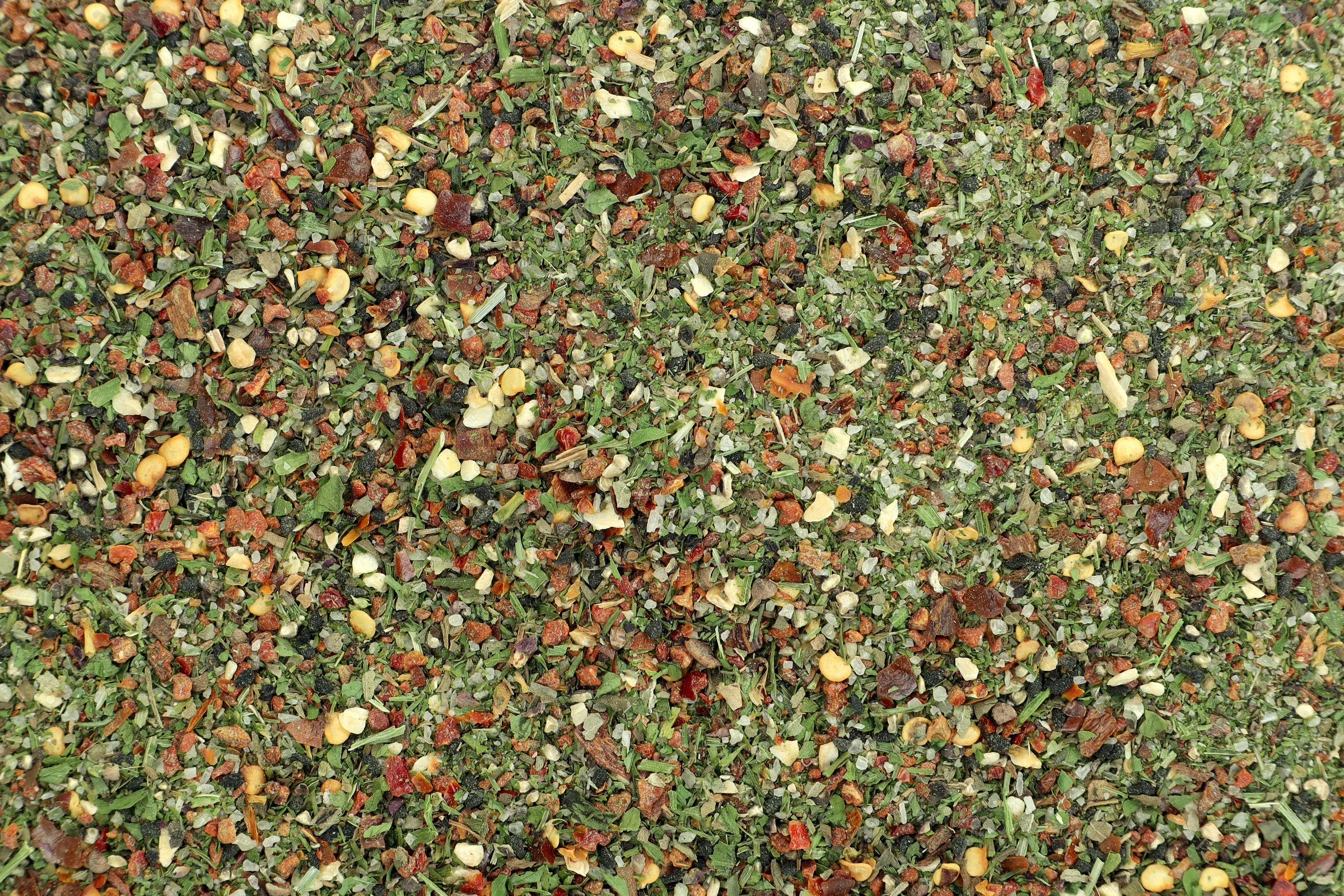 Základ tvoří sušená rajčátka a sladká paprika, které dodávají salátu kulatou, lehce nasládlou chuť a krásnou barvu. Doplňují je bylinky – bazalka, pažitka a petržel – které přinášejí svou svěžest. Jemná ostrost česneku a černého pepře k nim přidávají hloubku, zatímco špetka chilli vše lehce přiostří. Zajímavý akcent přináší černucha, která má jemně oříškovou, zemitou chuť. A na závěr přichází jemný solný květ, fleur de sel, který všechno zaoblí, aniž by přebíjel ostatní chutě.