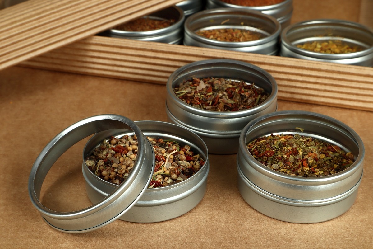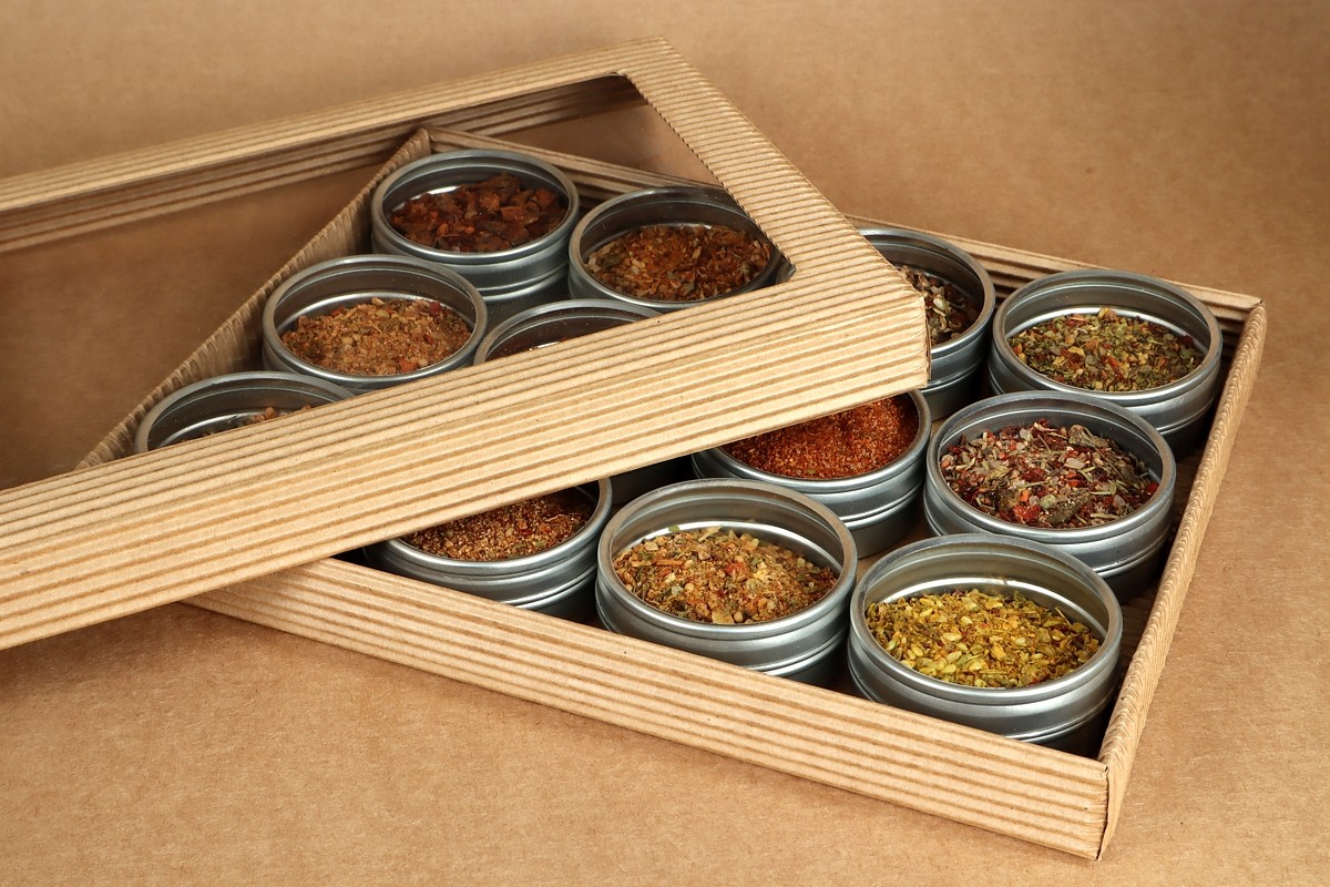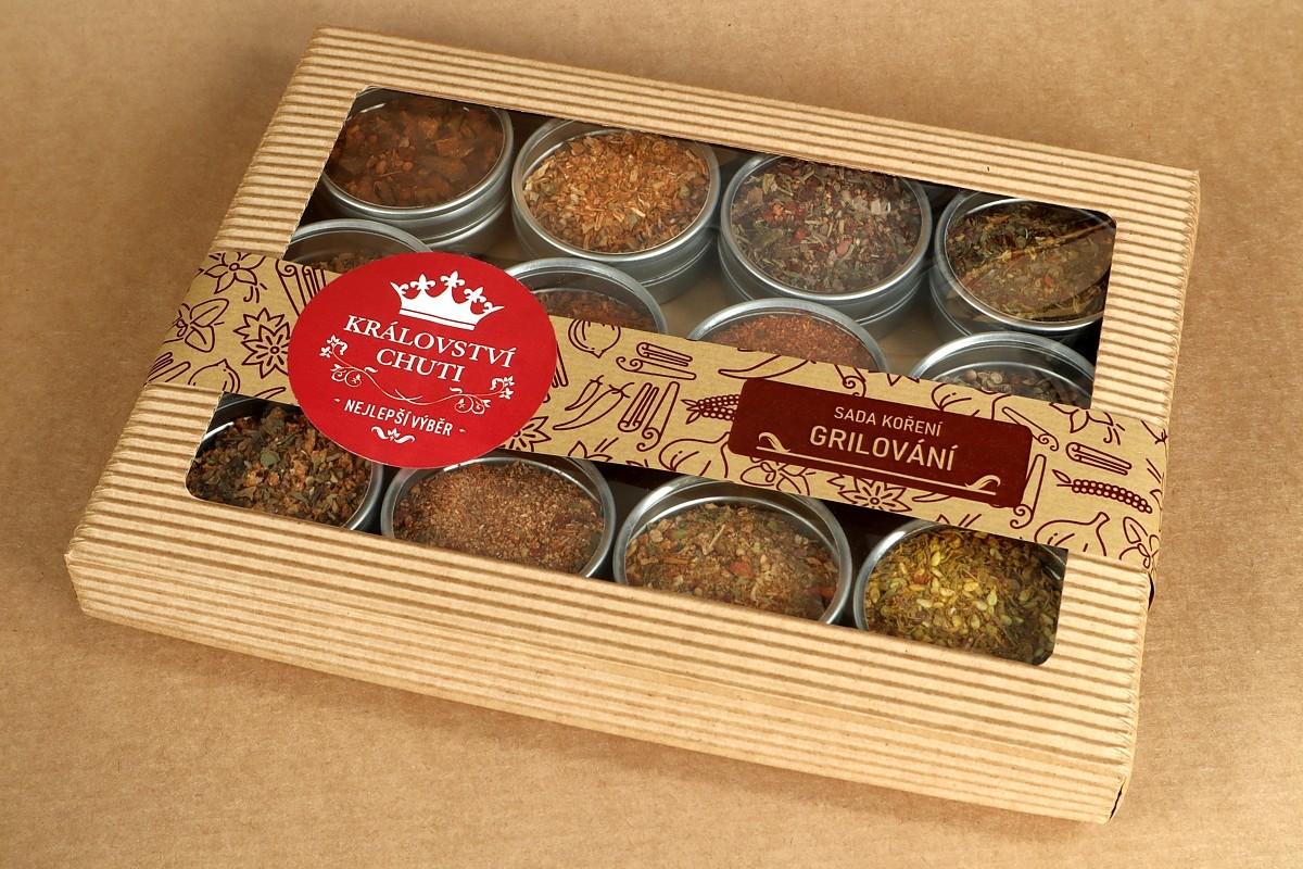Výběrová degustační sada 12 koření na grilování v kovových kořenkách. Sada má rozměr 22 x 17 cm. Jednotlivé kořenky mají průměr 5 cm a výšku 2 cm. Na spodní straně každé kořenky je popis obsahu.