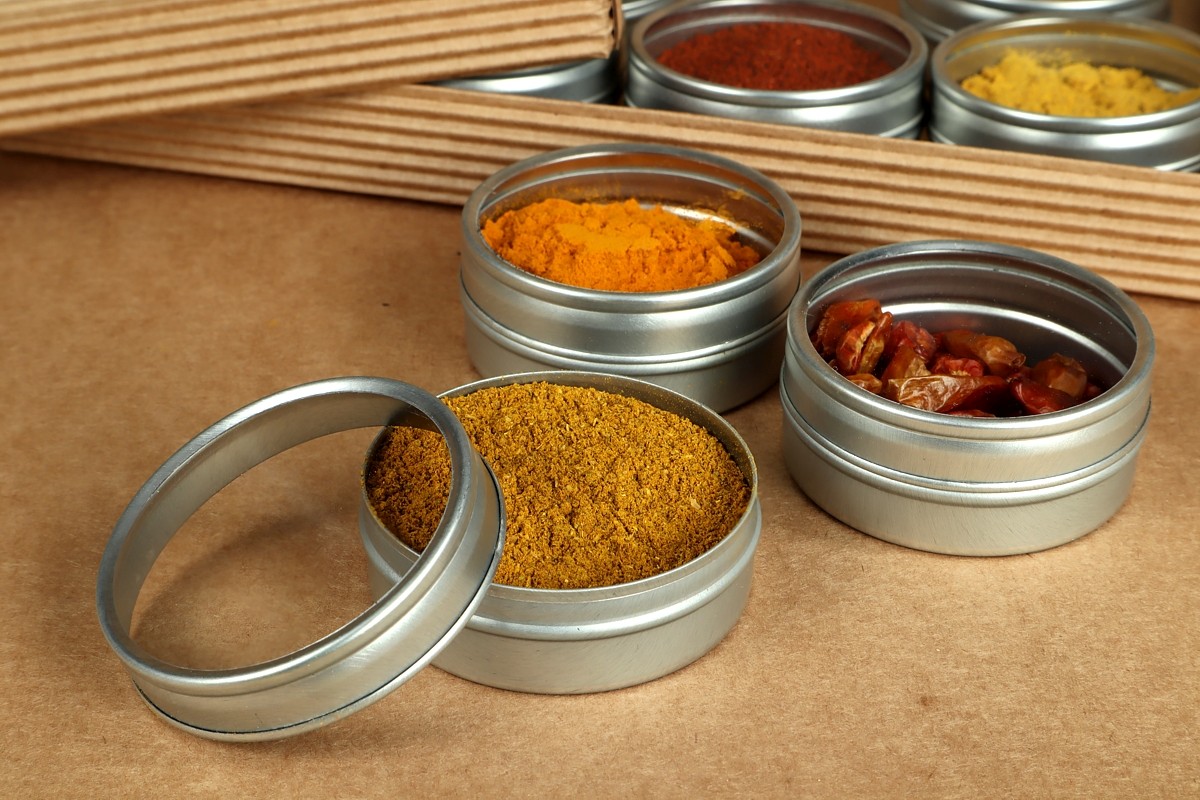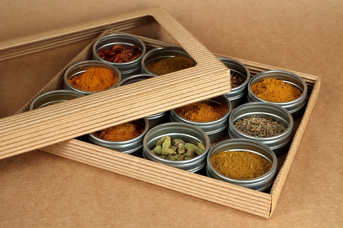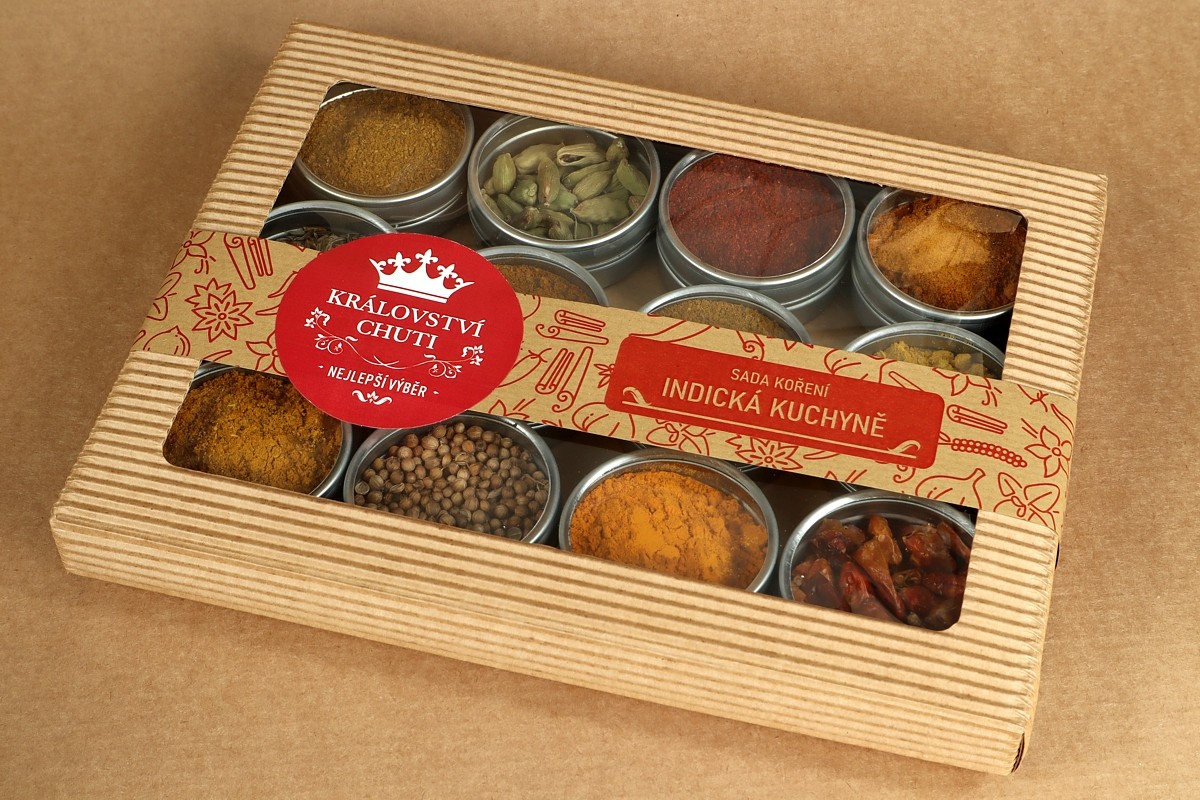 Výběrová degustační sada 12 koření indické kuchyně v kovových kořenkách. Sada má rozměr 22 x 17 cm. Jednotlivé kořenky mají průměr 5 cm a výšku 2 cm. Na spodní straně každé kořenky je popis obsahu.