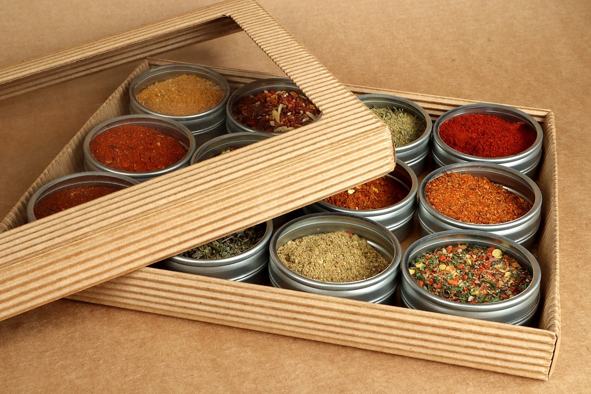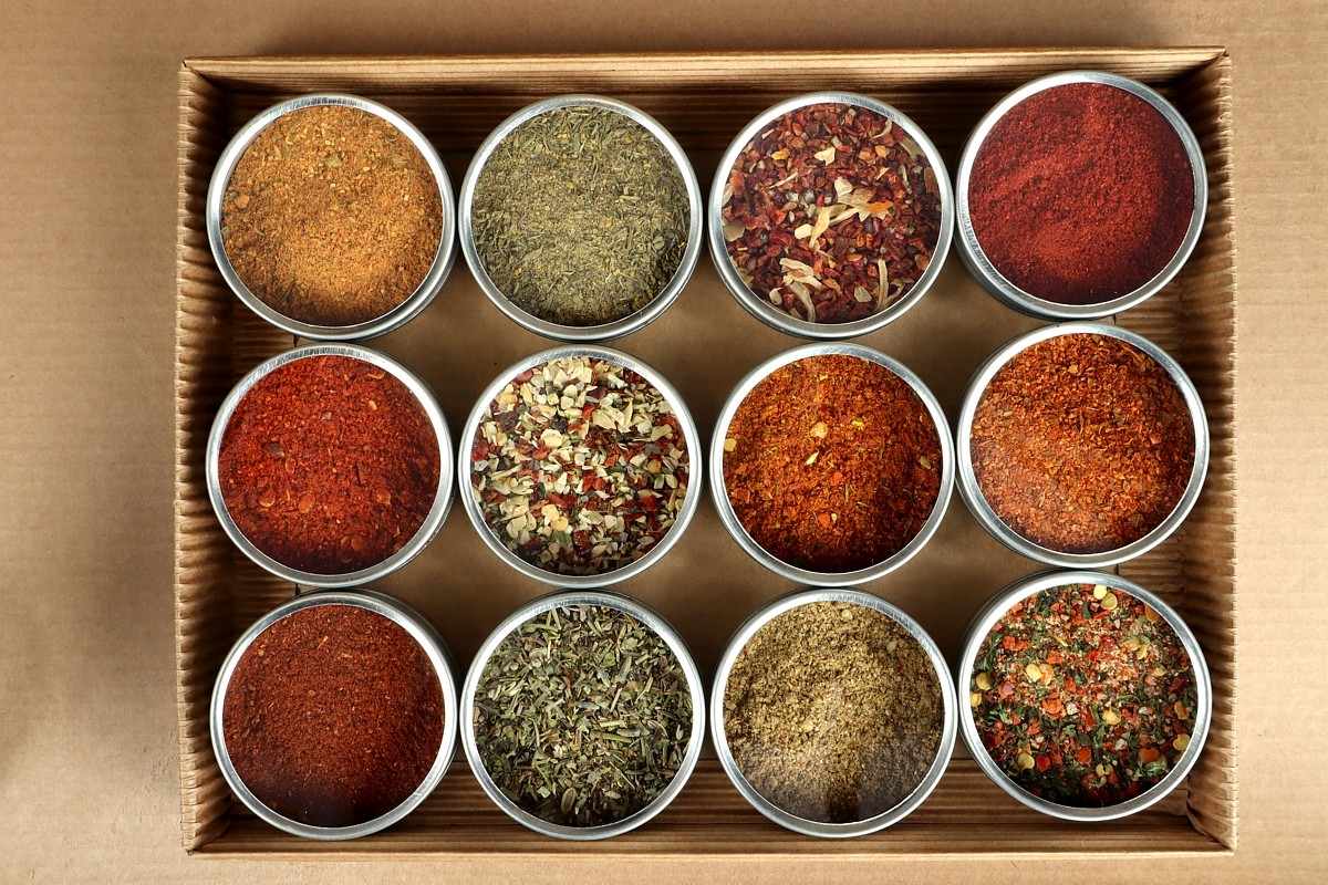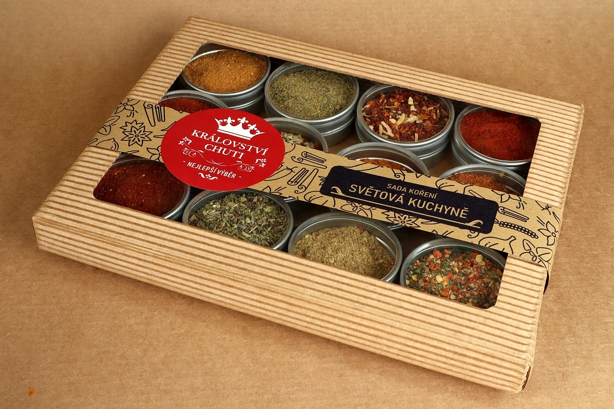 Výběrová degustační sada 12 různého koření světové kuchyně v kovových kořenkách. Sada má rozměr 22 x 17 cm. Jednotlivé kořenky mají průměr 5 cm a výšku 2 cm. Na spodní straně každé kořenky je popis obsahu.