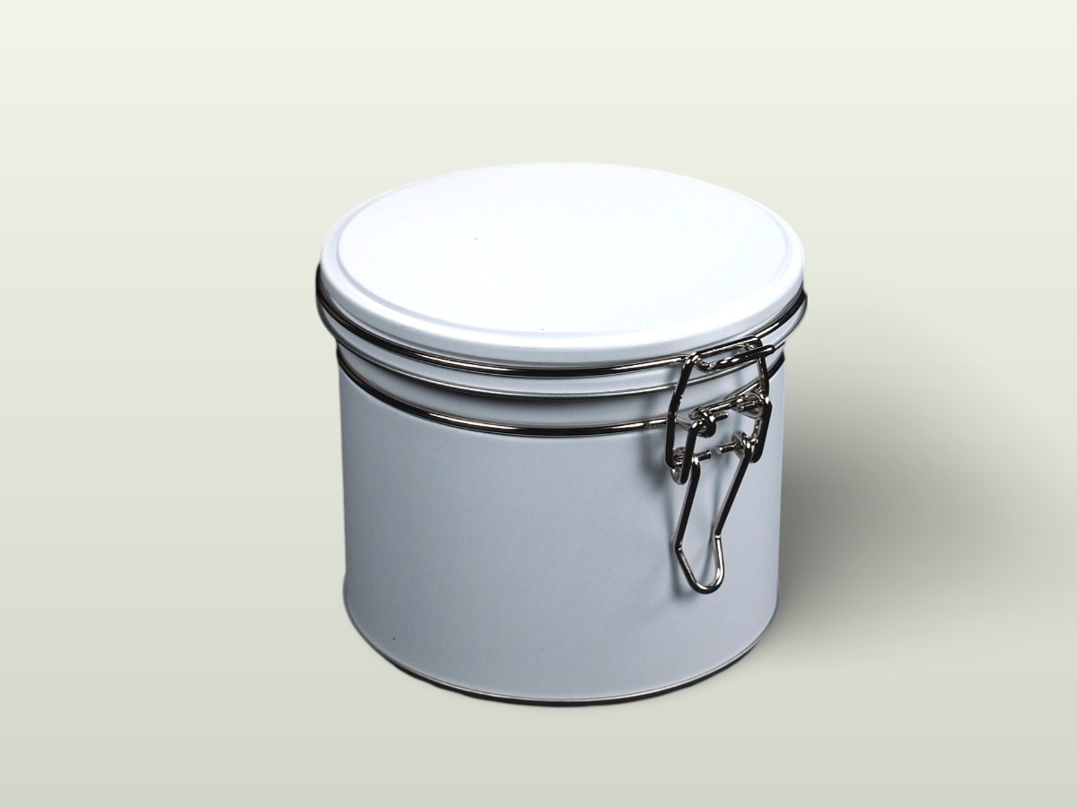 Nízká bílá plechová dóza s uzavíráním na klip. Víčko je opatřeno gumovým těsněním, které hermeticky chrání obsah dózy. Obsah tak bez přístupu vzduchu dlouho vydrží čerstvý. Dóza je vhodná na čaj, kávu, bylinky a další sypký sortiment.