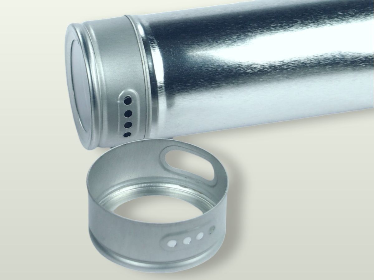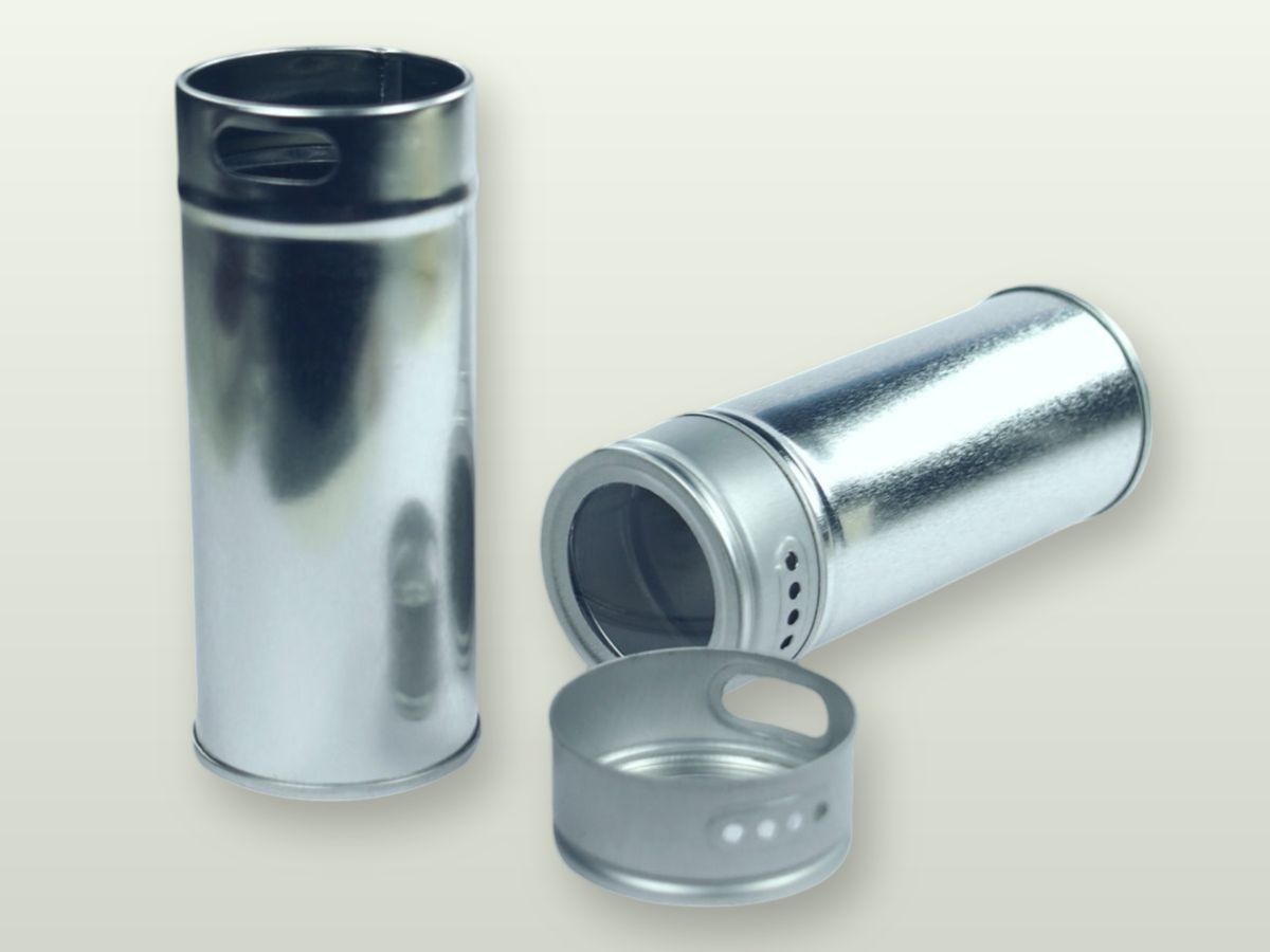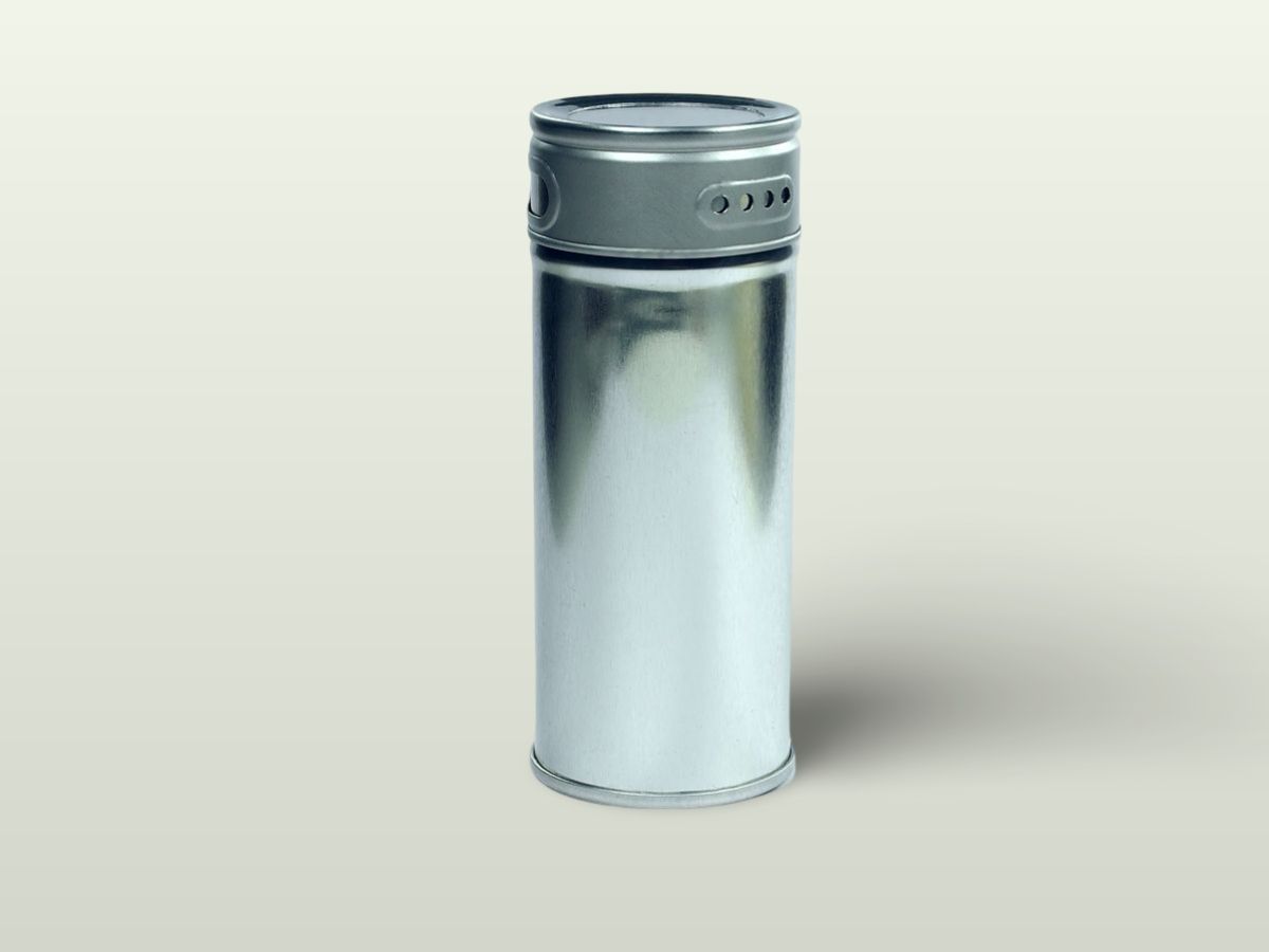 Úzká kulatá plechová kořenka o průměru 40 mm a výšce 101 mm s průhledným víčkem z akrylátového skla. Objem kořenky je 90 ml. Po stranách kořenky jsou dva druhy otvorů pro snadné dávkování koření.