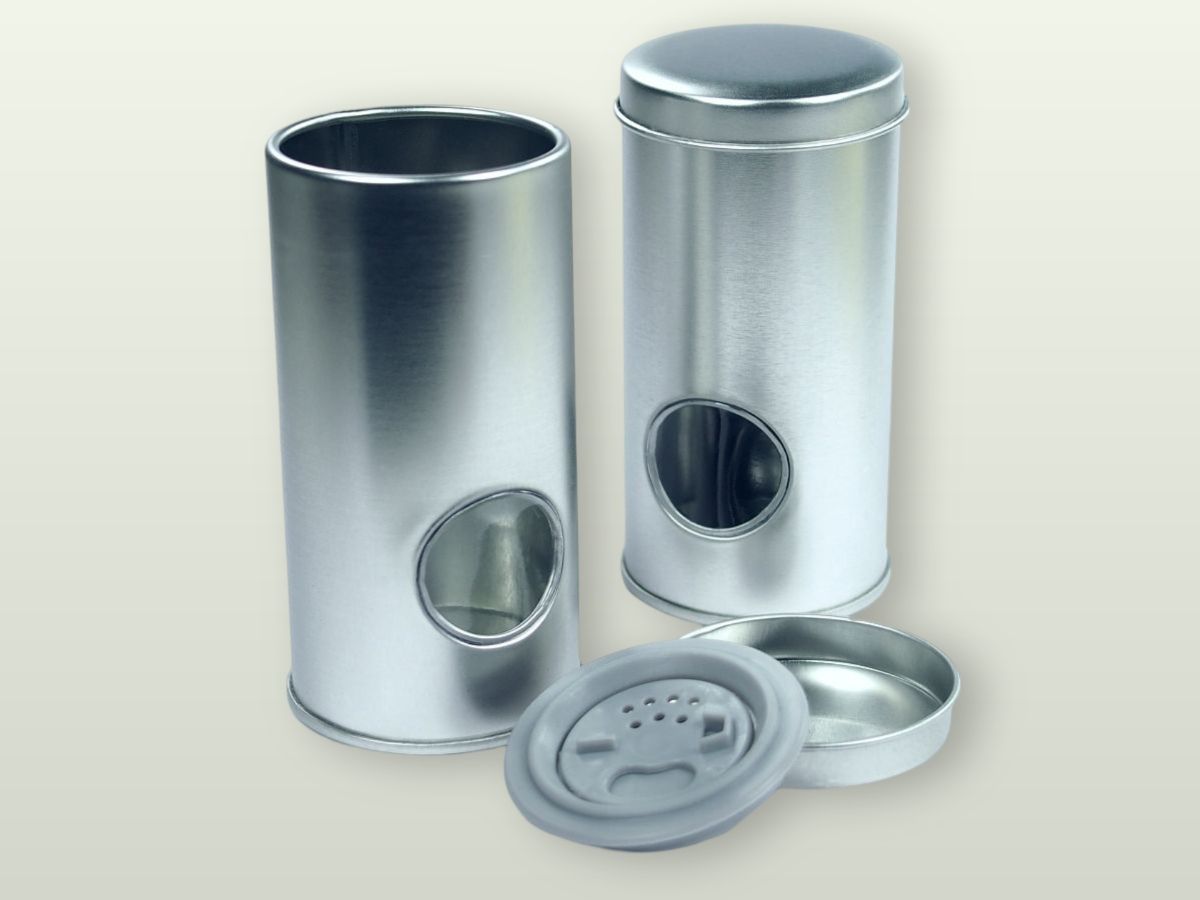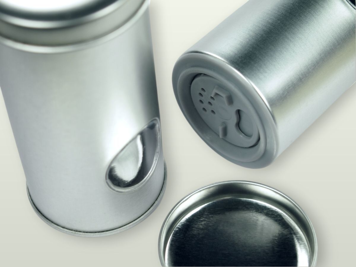 Kulatá plechová kořenka o výšce 93 mm a průměru 45 mm. Objem kořenky je 110 ml. Kořenka má v přední části kulaté okénko pro kontrolu obsahu a pod víčkem je opatřená vložkou z plastu se dvěma velikostmi otvorů pro snadné dávkování koření.