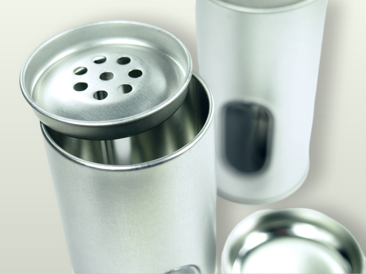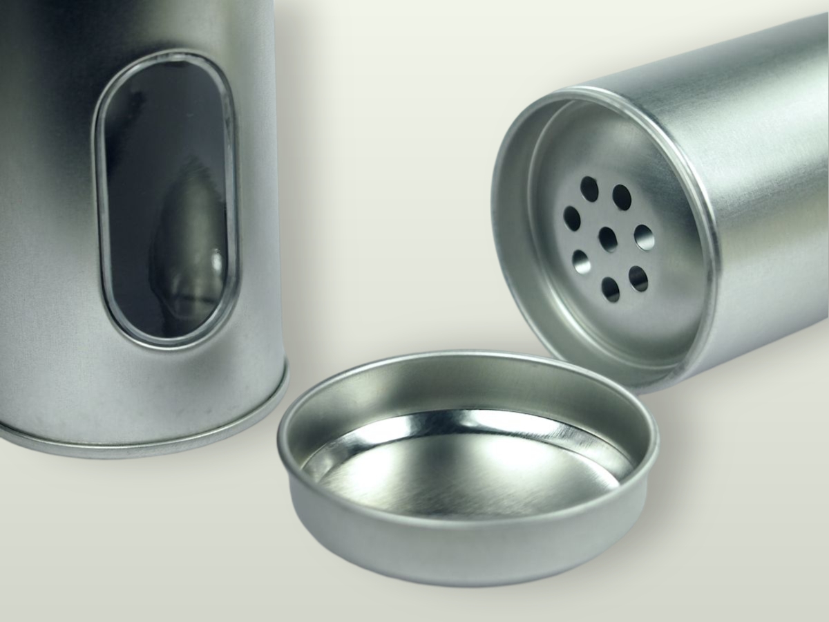 Kulatá plechová kořenka o výšce 110 mm a průměru 50 mm. Objem kořenky je 150 ml. Kořenka má v přední části kulaté okénko pro kontrolu obsahu a pod víčkem je opatřená vložkou z kovu s osmi otvory pro snadné dávkování koření.