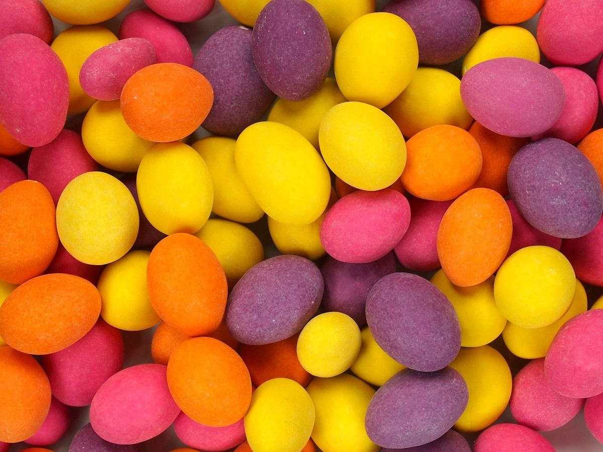 50 % mléčná čokoláda (cukr, sušené plnotučné MLÉKO, kakaová hmota, kakaové máslo, SYROVÁTKA z mléka, SOJOVÝ lecitin E322, přírodní vanilkové aroma), 30 % cukr, 20 % MANDLE, arabská guma E414, barviva (E101, E120, E132, E160a, E171), rostlinný tuk palmový, tapiokový dextrin, glukozový sirup, malinové, borůvkové, citronové a pomerančové aroma. Výživové údaje na 100 g: Energie 2085 kJ / 498 kcal, Sacharidy 59,8 g - z toho cukry 58,45 g, Tuky 24,3 g - z toho nasycené mastné kyseliny 8,9 g, Bílkoviny 7,5 g, Vláknina 3,6 g, Sůl 0,14 g.