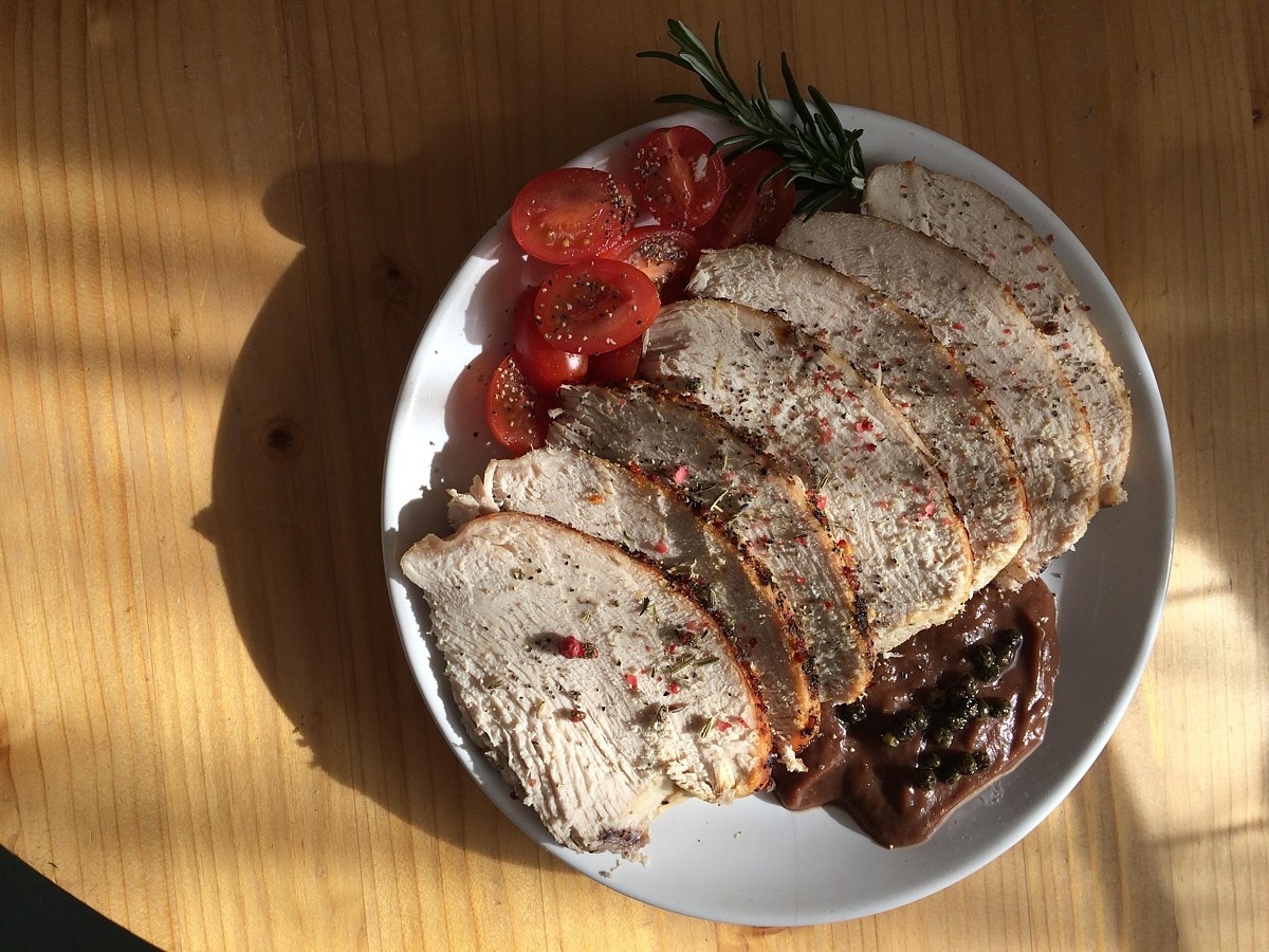 Červené víno se může zdát netradiční k bílému masu. Chuťově se ale velmi dobře snoubí a navíc dodá pečínce růžový nádech. Maso neotáčíme a v momentě, kdy máte pocit, že je dostatečně propečené, potíráme hřbet medem, přidáme půl lžičky másla a posypeme pařížským pepřem. Dopékáme, měla by se vytvořit krásně zlatá lákavá kůrčička. Jakmile vůně prostoupí celým bytem, maso krájíme na tenké plátky. Šťávu s výpekem rozmixujeme, pokud je příliš hustá, ředíme vínem a přidáme hořčici mletou. Servírujeme společně s bramborem nebo chlebem. Omáčka patří do samostatné konvičky na podlévání. Dip stačí jogurtový s nasekanou zelenou petrželkou, pažitkou, pokud není zrovna k mání, sáhneme po sušených bylinkách. Za vyzkoušení stojí kerblík. Ohromit se podaří i jogurtovou omáčkou se sambalem, který změní bílé jogurtové neviňátko v ďábelskou pochoutku. Omáčku můžeme ozdobit nakládaným zeleným pepřem.