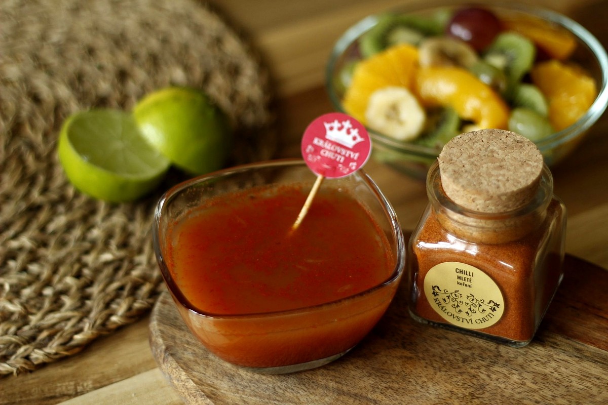 Do limetkové šťávy přidejte med a chilli a důkladně rozmíchejte. Druh chilli papriček si vyberte podle svých preferencí od jemného Kashmiri, přes snesitelné Jalapeño, až po ďábelskou Carolinu. Pokud do zálivky přidáte ještě panáka tequily nebo bílého rumu, získá salát další dimenzi a vaše párty možná také :-). Pro dokonalý efekt při servírování misky s ovocem ozdobte chilli nitěmi.