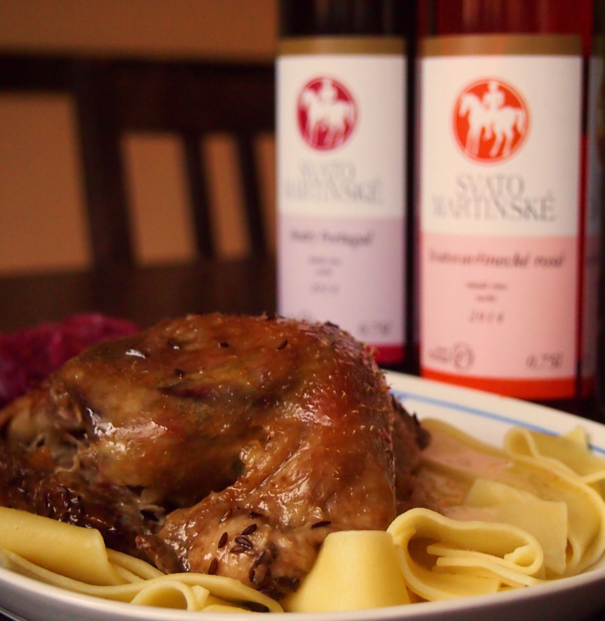 Jestli stejně jako já nemusíte moc knedlíky, vyzkoušejte jako přílohu široké nudle. A samozřejmě červené zelí.