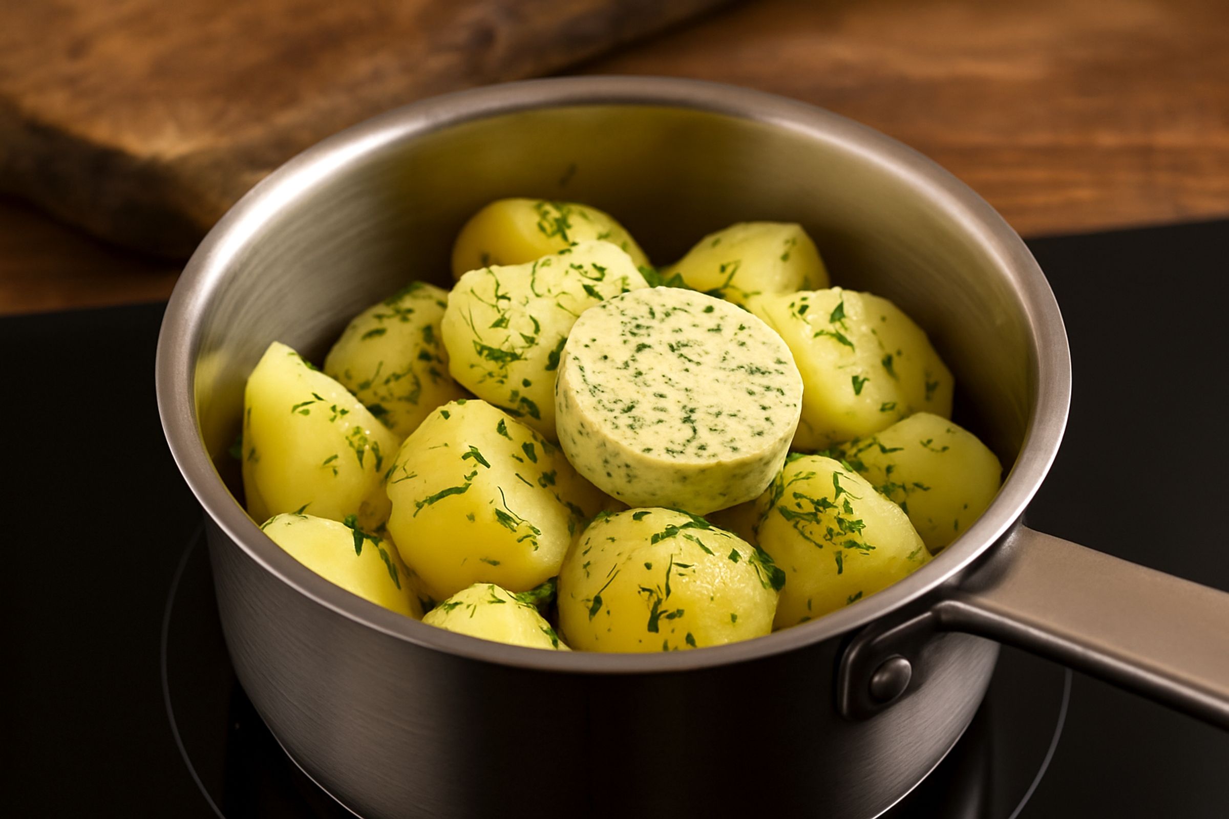 Tahle kombinace je jednoduchá a přitom naprosto dokonalá. Stačí nové brambory dobře omýt (neloupat), uvařit ve slupce a poté ještě horké promíchat s domácím bylinkovým máslem. Naprosto dokonalé je koření na bylinkové brambory. Je to jemná, voňavá směs bylinek, která s bramborami dokonale ladí.