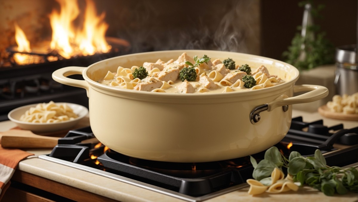 - Do pánve přidejte kuřecí vývar a smetanovou omáčku a průběžně míchejte asi 2 minuty.