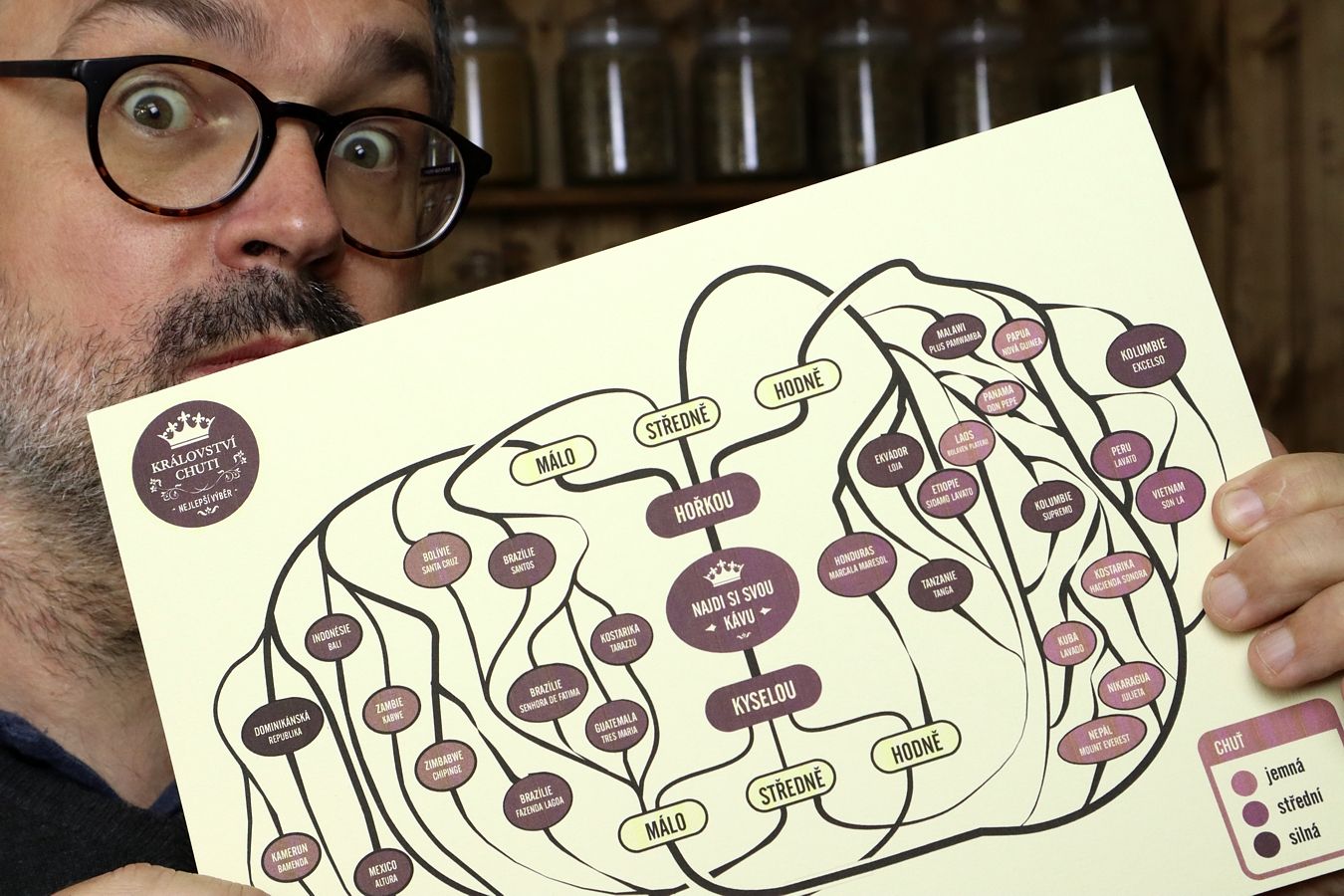 Nakonec jsem prohlásil "dejte mi do pátku čas, zkusím něco vymyslet". Tak jsem si večer udělal kafe, vzal tužku a začal malovat jednoduchý rozcestník jak si vybrat kávu. No jednoduchý. Když jsem po pěti hodinách kreslení, gumování, čmárání a vystřihování skončil, vznikla spíš tajemná mapa k nějaké dobrodružné hře, než návod ke snadnému výběru kávy. Však posuďte sami. Asi to vypadá, že nakonec přeci jen vyrobíme tabulku. Nebo letáček. A nebo mobilní aplikaci, ať jdeme s dobou.